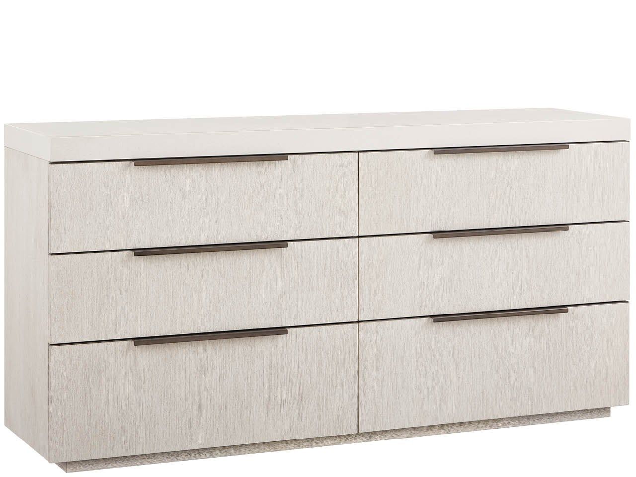 The elegant Quartz Dresser elevates the simple storage form into a sculptural moment with its luminous White Quartz top. Set against the soft Mist oak finish, this six-drawer piece defines luxury with sophisticated Smoked Gold hardware.